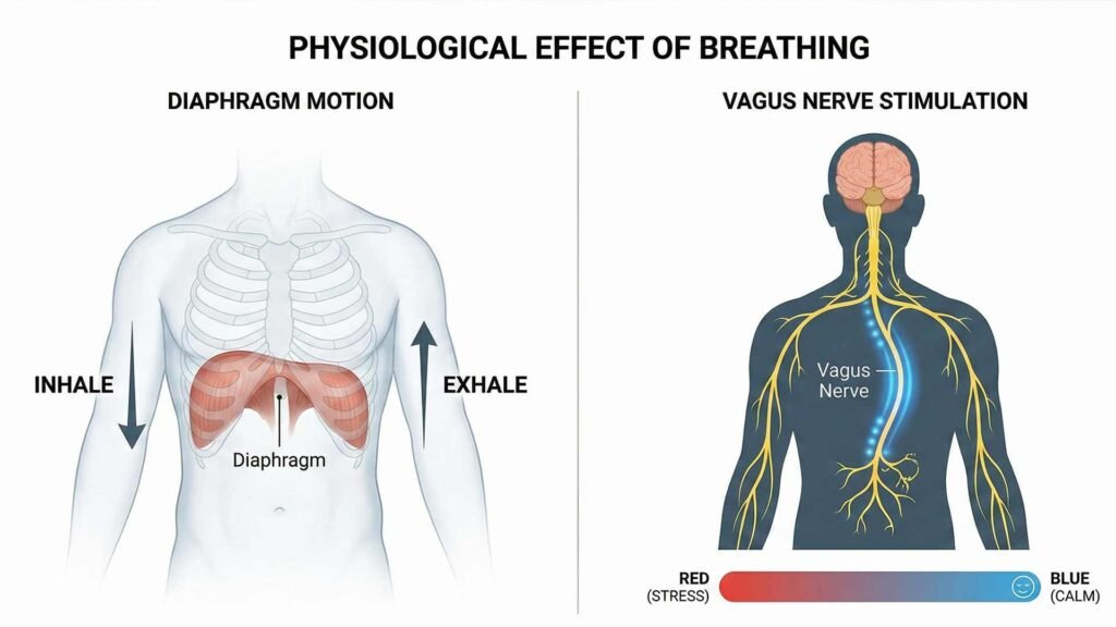 • Stimulation: Slow, deep, and elongated exhalations stimulate the Vagus nerve. This stimulation acts like a gentle brake on the entire system.